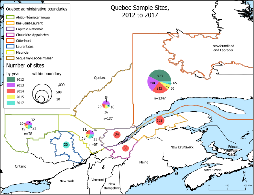 Patrick, Kate, and Jessica embark on fieldwork, sampling spruce budworm in Quebec.
